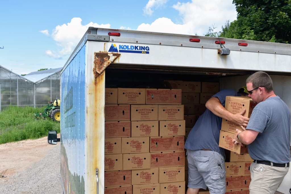 In response to both the economic and health emergencies, the U.S. Department of Agriculture (USDA) partnered with national, regional, and local businesses to implement the “Farmers to Families Food Box Program.” The goal: purchase billions of dollars in produce, dairy, and meat products, package them into family-sized boxes, then transport them to food banks and other non-profits serving Americans in need. Though the majority approved for the program were large-scale food processing companies, there was one supplier, a family farm in our corner of the world, also selected: Coveyou Scenic Farm Market of Petoskey.
